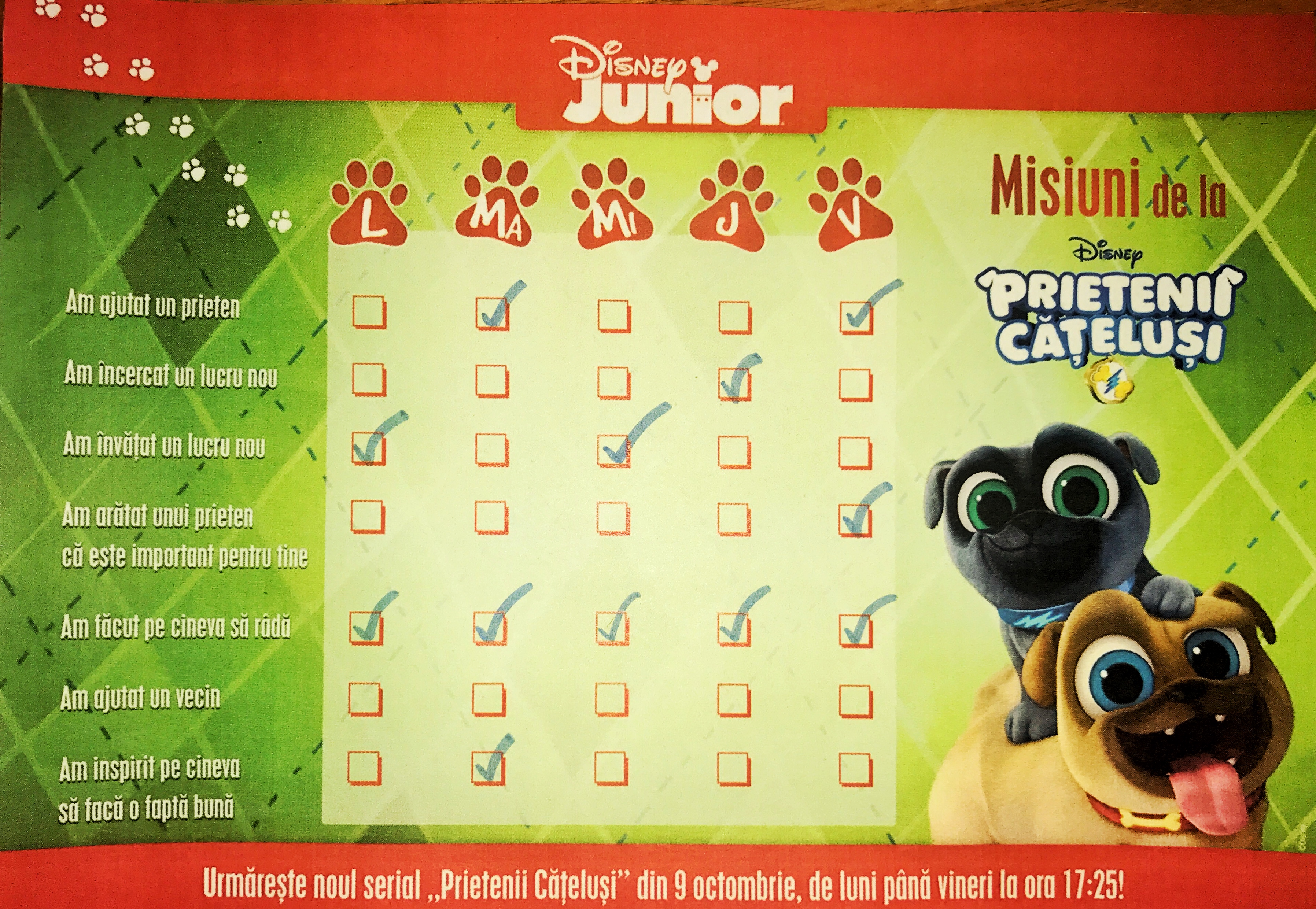 In fiecare episod, catelusii au de indeplinit o misiune, si cred ca va amintiti ca toata saptamana, la provocarea Disney Junior Romania, si noi am avut o serie de misiuni pe care a trebuit sa le indeplinim. Mai mult, am primit un calendar pe care sa putem sa marcam unde suntem cu fiecare dintre ele, asa ca a fost usor si distractiv sa il completam cu Sofia. Ce ziceti, ne-am descurcat bine?